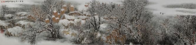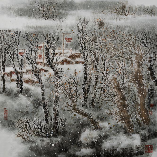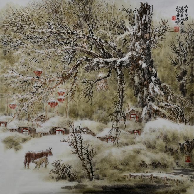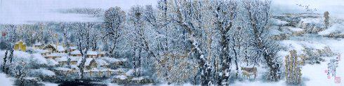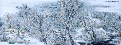 杜晓波作品中的景观,偏向于自然景观,源于他深入生活的底蕴和现实体验,多以横帔长幅的形制构图,时有立轴或斗方。他觉得横幅构图更有利于展示山舞银蛇、漫漫无际的雪乡吞吐大荒的壮观。他的取材多为皑皑雪山、冷冷冰河、层层玉树、雪压村舍,间有红灯高挂、玉米高筑、炊烟袅袅、喜鹊喳喳、牛羊欢呜……那天高地阔的境界,那深厚苍莽的意象,那充满生气的山景,既有别于古人冷寂荒寒的隐居山水,也不同于今人盛行于北方的“冰雪山水”。杜晓波力图展现的是与人类同在的永恒自然,是令人动心动情的生生不息的乡民栖息之的地。因此,他笔下雪乡景观的呈现,不用提炼过甚的笔墨符号,不作模糊印象的抽象处理,从局部和细节而言,颇有真实感从作品的整体而言,又有高度的综合和概括,既不乏古代雪景山水的营养,又巧妙地把包括形、光、色、明暗在内的西画创作技巧,有机地融在写意的传统笔墨体系之中使画面丰厚而富有体积感、质量感和现代气息。