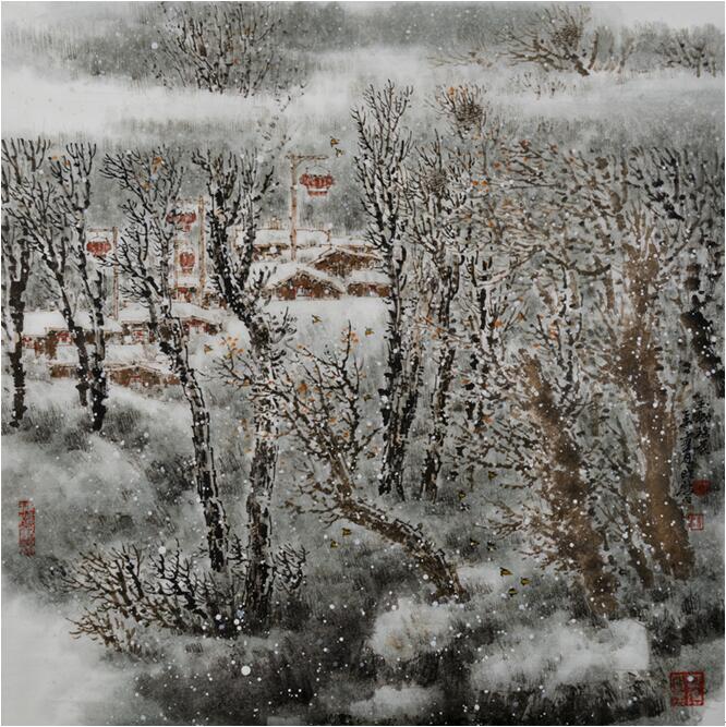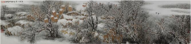 杜晓波作品中的景观,偏向于自然景观,源于他深入生活的底蕴和现实体验,多以横帔长幅的形制构图,时有立轴或斗方。他觉得横幅构图更有利于展示山舞银蛇、漫漫无际的雪乡吞吐大荒的壮观。他的取材多为皑皑雪山、冷冷冰河、层层玉树、雪压村舍,间有红灯高挂、玉米高筑、炊烟袅袅、喜鹊喳喳、牛羊欢呜……那天高地阔的境界,那深厚苍莽的意象,那充满生气的山景,既有别于古人冷寂荒寒的隐居山水,也不同于今人盛行于北方的“冰雪山水”。杜晓波力图展现的是与人类同在的永恒自然,是令人动心动情的生生不息的乡民栖息之的地。因此,他笔下雪乡景观的呈现,不用提炼过甚的笔墨符号,不作模糊印象的抽象处理,从局部和细节而言,颇有真实感从作品的整体而言,又有高度的综合和概括,既不乏古代雪景山水的营养,又巧妙地把包括形、光、色、明暗在内的西画创作技巧,有机地融在写意的传统笔墨体系之中使画面丰厚而富有体积感、质量感和现代气息。