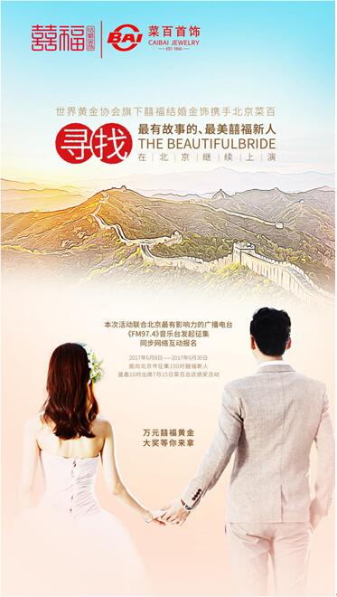 本次“寻找最感动北京爱情故事之最美囍福新人”的征集活动,囍福将携手北京菜百首饰,同时联合北京最有影响力的广播电台《FM97.4》北京音乐台,及众多知名新媒体共同发起。 届时,将会在全北京地区,寻找100对囍福新人,送上由菜百及囍福精心制作的“囍福婚书”和“囍福金箔”。同时,将邀请囍福专家团和媒体共同评选出10对新人,前来参加2017年7月15日在北京菜百总店举办的颁奖典礼,最终选出一对北京囍福新人,送上价值两万元的囍福黄金产品一套。