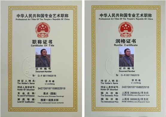 2017年,由全国专业艺术人才评定委员会、全国艺术品评定鉴定中心联合评审,李钧峰同志提交的国家一级美术师相关艺术品作品申请材料,经严格审核认证程序,已具备相应资质水平,授予李钧峰同志国家一级美术师职称证书。