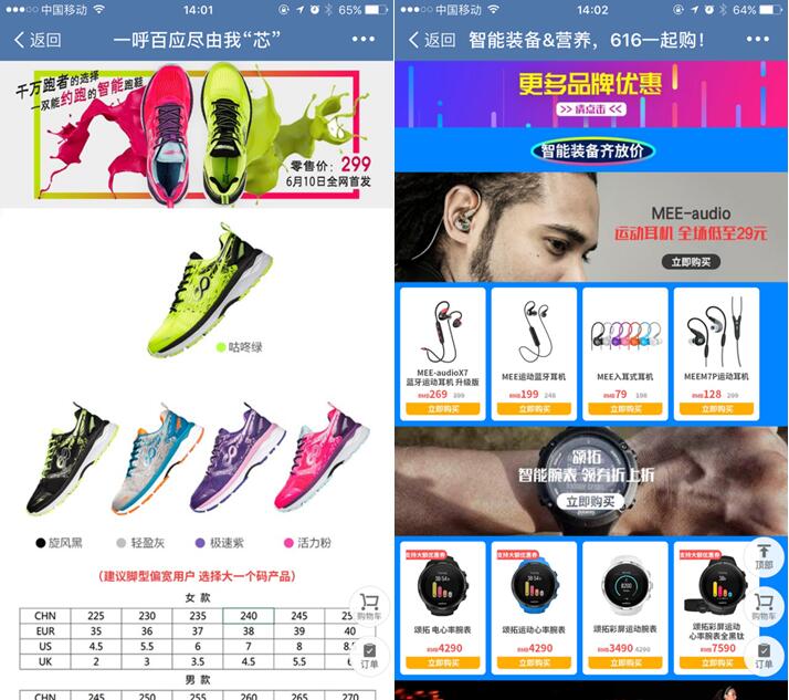 咕咚“616装备Party”,首推的品类是名牌跑鞋,这和咕咚用户当中大量跑友的日常运动需求密切相关。除了咕咚智能跑鞋RF的“预热先火”,咕咚自有品牌的速干T恤、耐力护腿、赛事背包等产品,与大牌生产线合作OEM,品控让人放心,加上优惠券的动心折扣,也是抢手货。