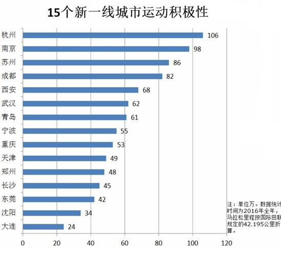 值得注意地是,今年的指标维度除了商业因素之外,依然按照去年的标准采用了生活方式多样性,包括餐饮多样性、文娱消费、旅游意愿、运动积极性以及消费多样性等多个指数标准。 而全国最大的运动社交平台——咕咚从2016年就开始携手第一财经参与该项目,为该项目提供了关于众多城市的运动数据,作为评判新一线城市的指数之一。 根据咕咚提供的数据显示,在全国338个城市中,北上深广不仅是全国一线城市,还是运动最积极的四大城市,其中首都北京是运动积极性最高的城市,2016年全年运动公里数超过1.3亿公里,折合成马拉松数量,相当于北京人民在过去的一年跑了308万个马拉松。而紧随其后的是上海人民,2016年全年跑了9300多公里,折合成马拉松,相当于跑了220万个马拉松。之后是深圳人民2016年全年跑了7800多万公里,相当于跑了185万个马拉松,广州人民跑了6100多万公里,相当于145万个马拉松。 北上深广作为国内人口聚集最多的城市,运动用户多,运动量大也是合情合理。而15个新一线城市的运动积极性指数到底如何呢? 其实15个新一线城市中最积极运动的城市并非是第一名成都,而是排名第二的杭州。咕咚的数据显示,2016年杭州人民全年运动超过4500多万公里,折合成马拉松相当于跑了106万个,接下来是南京人民,全年运动超过4100多万公里,折合成马拉松相当于跑了98万个,第三名则是苏州人民,全年运动超过3600多万公里,折合成马拉松相当于跑了86万个。