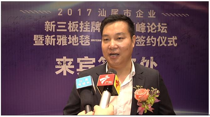 新雅地毯董事长倪创接受媒体采访 广东省工商联党组成员、秘书长、省非公所有制经济组织党委副书记李汉锋出席活动并发表讲话。他首先肯定了汕尾市人民政府关于民营企业的工作成效及广东省经企联近两年关于会员服务特别是辅导企业上市的工作成果,称赞了新雅地毯在省经企联的悉心培育辅导下走向资本市场后的创新融合发展。他要求企业家们认真学习贯彻落实省第十二次党代会精神,围绕 “改革”、“创新”、“开放”、“整合”四个方面就企业发展问题提出了意见,要求企业家们认真学习贯彻落实省第十二次党代会精神,一,供给侧改革问题,即优化问题:如何优化产品、管理、观念、创新方法;二,自主创新问题:如何推动企业创新;三,开放问题:在“一带一路”中如何开放企业 ;四,整合问题:如何整合资源、优化结构,让企业走得更远更大。