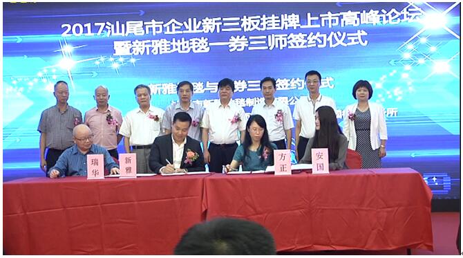 2017年6月14日,由汕尾市经信局、市工商联(总商会)主办、新雅地毯承办、省经企联指导、中国——阿拉伯国家技术文化转移中心及汕尾市城区经信局和市城区工商联(商会)等协办的“汕尾市企业新三板挂牌上市高峰论坛暨新雅地毯一券三师签约仪式”在汕尾显达酒店成功举行。本次活动是新雅地毯的一件大喜事,对于其进军新三板具有里程碑意义。同时它也是汕尾探索资本市场的一件大事,为汕尾新三板挂牌企业布局创新驱动发展战略提供理论基础和模式借鉴,对当地本土企业借助多层次资本市场实现经济腾飞产生深远意义。