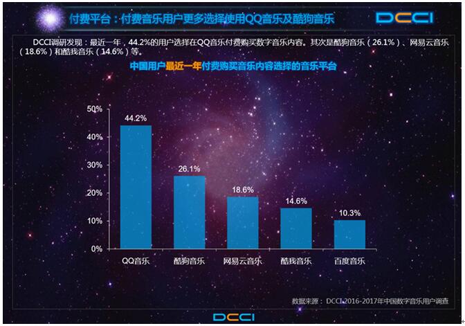 而据DCCI调研发现,最近一年,有44.2%的用户选择在QQ音乐付费购买数字音乐内容。未来一年,QQ音乐仍会是消费数字音乐最为热门的音乐平台,预计44.8%的数字音乐付费用户将会选择QQ音乐。这意味着,QQ音乐几乎囊括了国内数字音乐付费市场的半壁江山。
