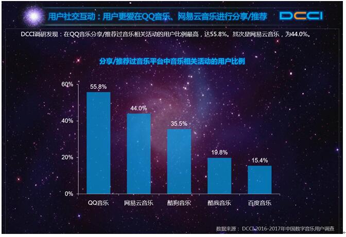 据DCCI调研发现,在QQ音乐分享、推荐过音乐相关活动的用户比例最高,达55.8%
