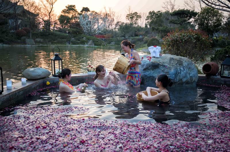 游客们在双莲女人温泉室外汤池区嬉戏 浪漫SPA呵护,为美丽加分 在双莲女人温泉,游客不仅可以享受迷人的景致、功效加倍的花草温泉汤池,还可以品尝鉴赏极富有艺术设计感、由四季花卉与名贵食材共同烹饪的养生花宴。此外,在温泉中心还设有独一无二的精美化妆间,不仅提供了免费的化妆品与保养品,华丽的汉服浴衣也别有一番韵味呢。而这其中,最解压减乏、令人享受的,便是双莲女人温泉的“精品SPA水疗护理”。双莲女人温泉在主建筑温泉大厅及泓庐SPA精品酒店中均设有“精品水疗SPA护理”项目,方便游客随时随地体验享受。所有的SPA水疗护理,都采用双莲女人温泉含有偏硅酸、锂、碳酸氢钠等多种矿物质的天然泉水,不仅提供皮肤必需养分,同时还具有独特的舒缓、嫩肤作用。在温泉水中浸泡10至15分钟后,身心都达到了进行下一步护理的最佳状态,辅以传统古法按摩技艺,西方纯植物萃取精油来达到舒缓疲劳、养颜美肤之效。将东方传统穴位智慧、现代水疗技术与西方现代植物精油按摩三者巧妙融合,带来最浪漫贴心的宠爱感受。这里每一位富有经验的SPA师,既可以用柔和的按摩方式缓解全身疲劳,也能依照游客需求,有针对性地进行穴位按摩,通过身体内循环排出毒素, 90分钟的护理,带来24小时的轻松愉悦,就是双莲女人温泉365天倾心呵护的承诺。