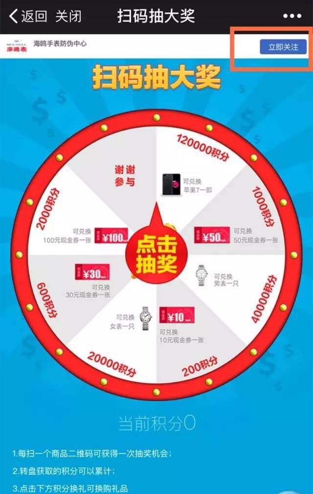 4.随后页面直接跳转到“扫码抽大奖”页面,点击上方蓝色“立即关注”按钮,关注“海鸥手表防伪中心”,并点击页面中部“抽奖”按钮,即有机会获得Iphone 7、海鸥男女款腕表、购表代金券等惊喜大礼(积分请在“海鸥表官方商城”兑换);
