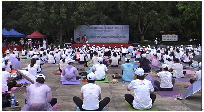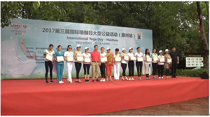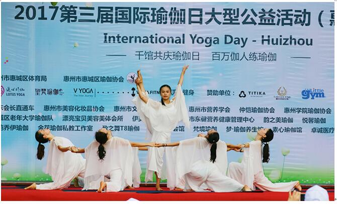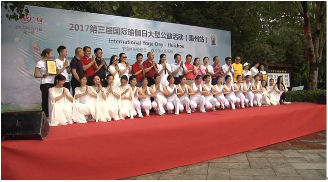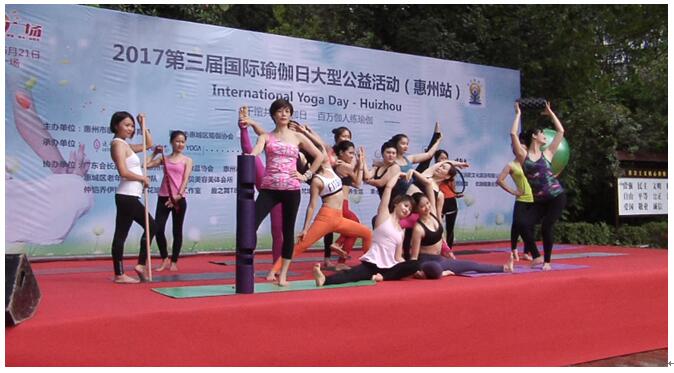 2017年惠州第三届“国际瑜伽日”举行 为迎接“国际瑜伽日”,感受瑜伽文化,倡导健康生活。2017年惠州第三届国际瑜伽日以“千馆共庆瑜伽日,百万伽人练瑜伽”为主题,于6月21日上午8点在高榜山广场隆重举行。此次活动是惠州市第三次“国际瑜伽日”大型公益活动,由惠州市惠城区体育局作为指导单位,惠城区瑜伽协会主办,莲心瑜伽、圣梵瑜伽、唯瑜伽等承办单位。市中华文化促进协会会长,广东会长直通车,中国瑜伽联盟副会长,惠州市商业交流合作协会会长等50多家单位协办,活动现场中有500多人参加一起练习瑜伽。自活动宣传以来,受到了瑜伽同仁及行业各界的广泛关注与大力支持。