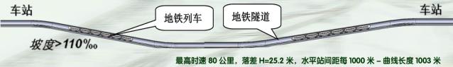 永磁悬浮悬架上悬浮重物试验 这项技术采用永久磁铁悬浮,悬浮不耗电,悬浮不需要电子控制系统,根据载荷的大小自动调整,100%克服负载重力,无论处于静止状态还是高速状态下都可以自动保持稳定悬浮。 这项技术应用在地铁上可让地铁行驶能耗节约95%,听起来似乎是不可思议的?!采用什么原理才能达到如此神奇的节能效果呢? 简单地说,地铁列车的行驶能耗主要是车轮滚动的摩擦阻力和空气摩擦阻力,还有更大一部分就是克服自身的惯性产生足够速度的动能,线路越长行驶滚动摩擦能耗越大;速度越快,空气的摩擦能耗就会越大,克服列车的动能也就越大,地铁一般运行区间在2-5公里,最高行驶速度一般是80公里时速,这种低速情况下,空气阻力很小,可以忽略。滚动摩擦能耗所占比重约占20%左右,列车的动能所占全部行驶能耗的比重约占80%左右。滚动摩擦能耗和列车的动能是需要主要考虑的。 采用这项被动永磁悬浮技术可以节省95%的滚动摩擦能耗,让占比20%的滚动摩擦能耗得到解决。其余的占比重约占80%的列车的动能该如何节省下来呢。 超级地铁 解决方法很简单,采用大坡度轨道的建设方式,将地铁驶离站台的出站口和即将进站的进站段附近都建设成110‰以上坡度的轨道,大概在7度左右,列车加速度可以达到1.1米/秒2,与现有地铁列车加速度一样。如果坡度达到11度,列车加速度可以达到1.5米/秒2。在地铁列车离开车站后马上开始沿坡度下滑,完全利用列车自重沿轨道方向的下滑力,不用电力牵引就可以实现自由加速,滑到坡底达到最大的速度80公里时速,然后经过水平路段滑行,只需要消耗很少的能量。在接近下一地铁站时,列车靠惯性冲上坡,利用列车上坡的后撤力自然减速,到达车站后刚好停车。
