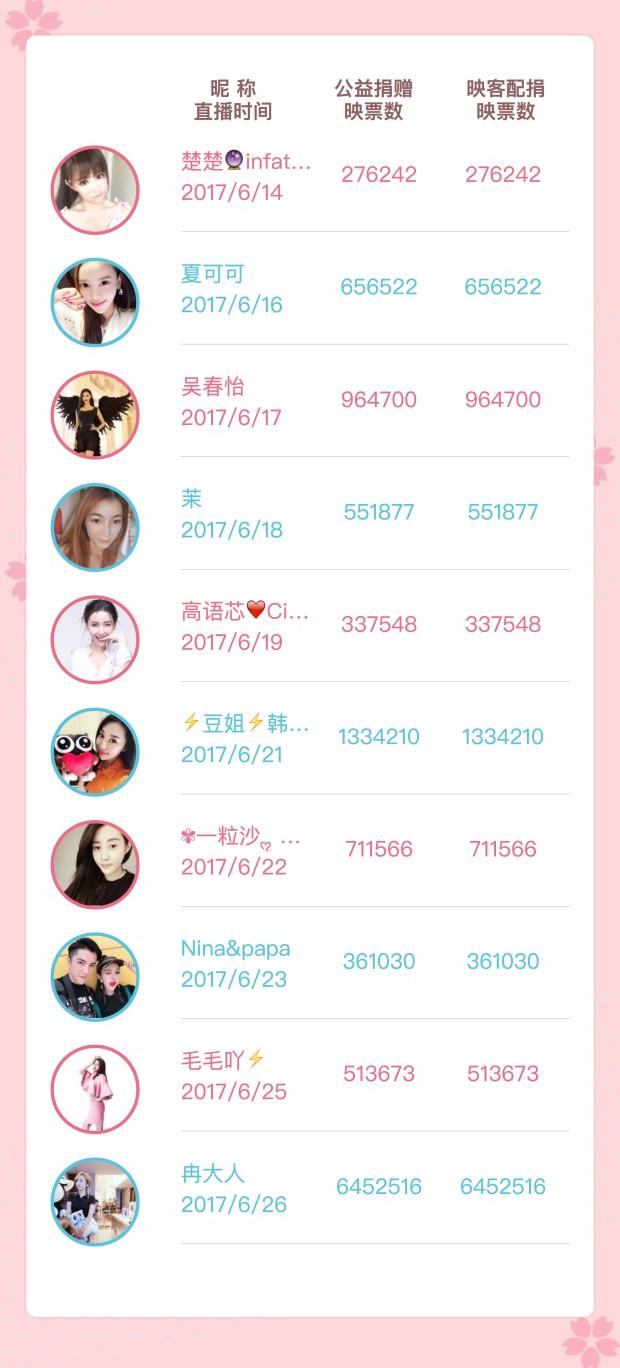 6月14日到6月26日期间,映客迎来一次别开生面的捐助行动:映客樱花女神们举办了一场“樱花女神公益特辑”——直播收入将全部捐于直播未来文化发展基金旗下的“小映助学”公益项目。“小映助学”是映客专为应届高中毕业生设立的助学公益项目,致力于帮助成绩优异被大学录取却无力负担学业和生活开支的入学新生,减轻他们的经济压力,安心在大学继续深造学习。 公益女神楚楚率先开播,其他九位女神一一接力,如同以往的捐赠方式,十位樱花女神捐赠映票的同时,映客也配捐同样的映票数。截止6月26日,此次“樱花女神公益特辑”参与捐赠人次超1万,收获24319768映票,折合人民币约759992.75元,这笔善款将通过直播未来文化发展基金送达优秀学子手中。