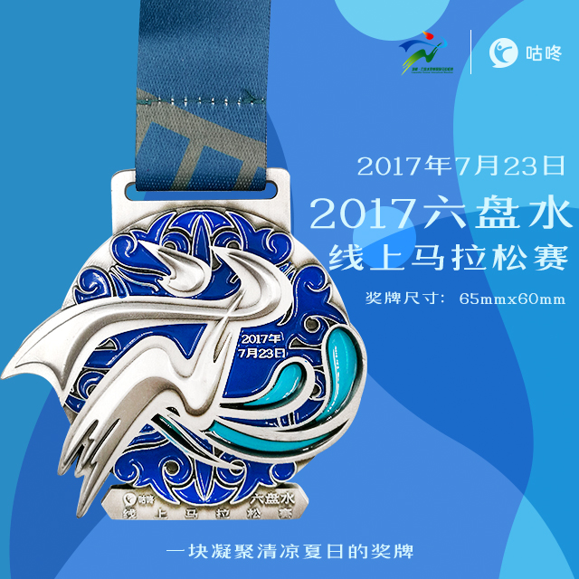六盘水拥有多民族交织的特色文化,成功举办四届的六盘水夏季马拉松,拥有极佳的口碑。在这片盛夏的宁静之地,随着蓝天、白云、微风、绿林,聆听自己的脚步,也聆听内心深处那个奔跑的自己。 贵州是多民族省份,每个民族都有独特的文化,也衍生出了不同的风情。2017咕咚六盘水线上马拉松的完赛奖牌,独取云之白、水之蓝、民族服饰韵味浓厚的藏青,献给所有跑友。最美的贵州民族服饰蜡染图案,并融入浪花元素,体现大自然带给六盘水的夏季馈赠。全新工艺还将浪花镂空,轻漆的喷涂呈现淡蓝的透明感,给人增添更多的愉悦感觉。