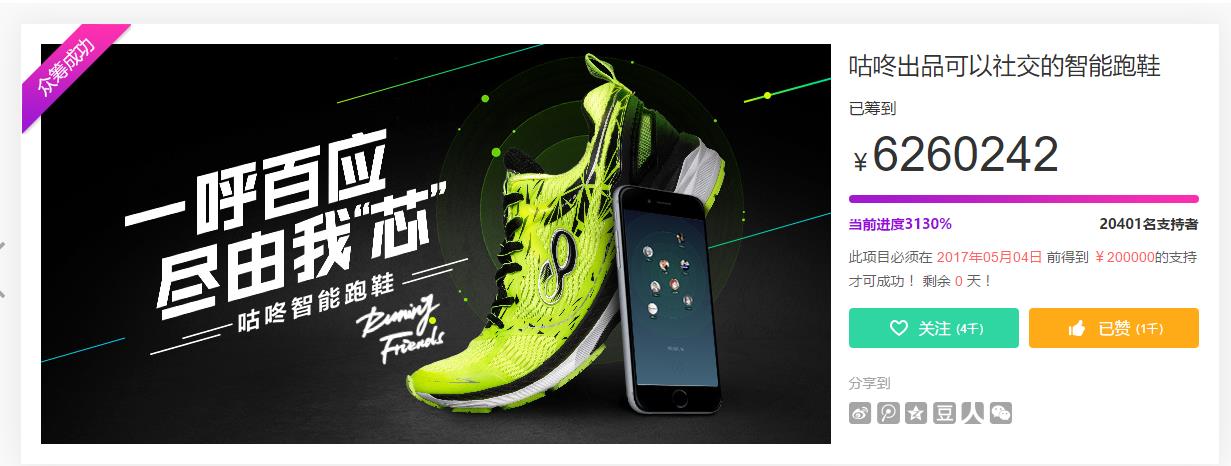 其实早在去年,咕咚就已经试水共享单车,当时在成都天府软件园有网友拍到拍到咕咚共享单车的实车照片,朋友圈也传出咕咚正在寻找自行车制造商,随后在脉脉、无秘等社交网络上多次出现有企业高薪挖角摩拜、ofo共享单车高层的传闻。 咕咚在共享单车方面,希望打入的是不同功能细分市场。此前咕咚已有过类似的思路:在3月中旬,咕咚与京东合作发起智能跑鞋RF的众筹,共有20104名支持者“疯狂认购”,总金额6,260,242元,完成目标金额3130%,助推“能社交的智能跑鞋”顺利杀进跑鞋界,成为跑者新宠。 咕咚智能跑鞋RF的“智能之处”有两个:一个是社交功能,运动过程中跺一跺脚,手机上咕咚APP就能自动获取附近5公里内(地图显示),最近3个小时跑步的8名咕咚用户,并向他们发起“约跑”。 另一个是不断进化的“多维度实时智能语音指导方案”,提供更好的人机交互线上服务,同时结合天气、温度等外部条件,提升运动安全指数。跑步过程中,咕咚智能跑鞋RF内置的智能芯片可以实时捕捉、监测脚掌落地的步频、步姿变化。与手机连接后,在咕咚后台完成数据分析,同步发出语音提示,实时纠正跑友步姿不当、步频起伏过大等毛病,避免意外伤病。