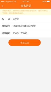 3.再次确认身份证信息及提现手机号后点击“手工认证”。