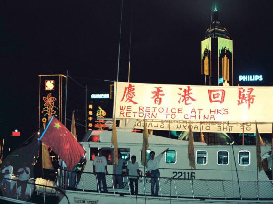 图为:彭定康带着全家上了坐驾离开了港督府 香港回归当天早上香港同胞庆回归大游行……我一早就到维多利亚湾广场去为准备等待晚上维多利亚湾烟花盛典摄影占位子,到了中午以后,维多利亚湾集满了一百多万来自全国各地和香港同胞,全世界各地的新闻媒体记者都在陆续赶来抢占位置等待观看七一晚上的烟火盛会。天继续下着大雨,很多人带着雨伞和雨具晚上人越来越多,我实在没有办法,站的位置正好是一个大花坛,由于下了大雨,花坛里面有水水深估计有20多公分。先架在那里的三脚架已经无法展开,连自己身体移动的空间都没有,如果你离开位置,马上就再没有好的位置了。半天多,从早上七点多等到晚上八点多钟。整个烟花盛宴整个举行了30分钟左右。拍到了很多漂亮的烟花,整个维多利亚湾的夜景。整个香港在烟花的照耀下更加的绚丽灿烂美丽绽放。很多摄影师在人群当中无法小便,只有自己心里明白,实在是太难熬了也得憋着。但是拍到了这个烟花盛会看到了维多利亚湾这么美丽的香港,心里还是感到温暖自豪和欣慰。7月1号晚上是一个不眠之夜,我把所有带去的胶卷全部拍完,拍到了凌晨三点多钟才收工,因为7月2号就要离开香港回到内地。几天下来深感疲惫,但是收获满满。回到浙江后,我跟出版社联络,一共出版了11套挂历。