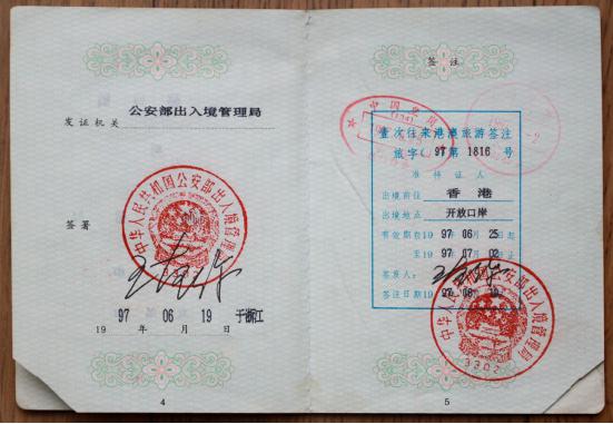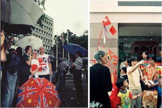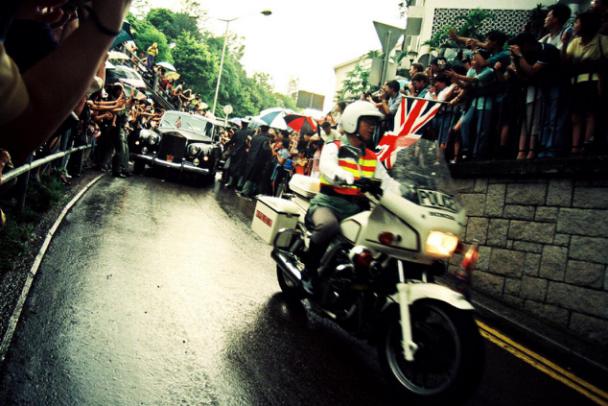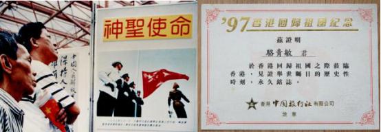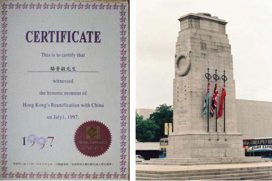 图:观礼团前往香港的通行证 那天的拍摄任务满满的,重重的,沉甸甸的。因为我们知道,自己将成为一个伟大的历史事件的见证人和记录者。作为一名摄影人,还有什么比这更荣耀更兴奋的呢?清楚记得当时整整提前两个小时我们就到了那里站位,占据最佳摄影位子,由于我是自费进入参加香港回归盛典摄影,没有记者证很难进入港督府大院内,我个子也不高,那天下着倾盆大雨,我背着摄影包,拿着相机全身湿透了,成千上万的人一条路上拥挤的水泄不通,想支撑三脚架都很难,我只好靠在栏杆上站着,那个最佳的位置,差点挤出人命。要不是我头一天就探好路和位置,这些都很难抢到好位置。港督府门前本来就不宽敞,一下子来了世界各地的一百多位记者,要抢到一个理想的采访位置其难度可想而知。位置上一站竟达两个多小时,几乎一动也不动。这就是平时练就的硬功夫。但此时此刻却又是在内地不曾遇到过的困难。你都不能打个招呼说离开一步,因为一离开,你就没位可占了。同时,由于大家都挤在一起,有时忽然不知哪来的什么力量把你推搡了一下,一不小心可能控制不住自己倒向别人身上,甚至被挤出去了,整整等待了两个多小时。终于冒雨看到了前面香港检查的摩托车开道,后面两辆高级轿车出来了。这是我人生当中第一次看到劳斯莱斯轿车,车里坐着的就是最后的香港总督彭定康。我就一只脚勾在栏杆上,半个身子探在外面迅速按下快门,这时前方正好有面英国的国旗被人挤得倒向轿车前方下往下倒。终于,彭定康先出现了,看得出他坐在车内是佯作镇静,但怎么微笑都难掩一个殖民者的最后失落感。彭定康是1993年到任的,是香港第28任港督。在任这几年他将香港搞得天翻地覆,特别是他搞的所谓“民主”,执意要将立法局直接过渡到回归后,遭到中方的严正拒绝。在一无所获的情况下退场,他于心不甘,当天整个下午港督府举行降旗仪式,飘扬了155年的殖民者的英国国旗终于降落了,彭定康含泪收拾起旗子后,带着全家上了坐驾离开了港督府。 6月30日,新闻媒体和摄影家这天是如同打仗一样东奔西跑,抢好机位,冒着倾盆大雨,这也彭定康手捧刚刚降下的英国国旗离开港督府,那边皇后象广场也要降英国国旗!天气时而放晴,骄阳猛烈;时而急雨,似箭冲刷。对彭定康来说,是昏暗灰霾,对港人来说,是洗刷百年耻辱。155年前的港督会想到有今天吗?香港在他的手里交回中国,实在是一件很痛苦的事。 那时香港大街小巷纷纷挂起中国国旗和香港特区区旗,香港回归大典在香港新会展中心举行。临近午夜子时,解放军通过深圳文锦渡口岸浩浩荡荡进入香港,沿途受到香港同胞的热烈欢迎。在香港警察开道车的引导下,解放军分秒不差地进驻位于金钟的解放军总部,和英军完成交接,我拍下了最先两名共和国驻港解放军总部的哨兵。与此同时,会展大厅的中华人民共和国国旗在港英旗降下后冉冉升起。中华人民共和国香港特别行政区成立大会正式开始。 1997年6月30 日这一夜,香港注定是个不眠之夜,这一夜,也注定让我无眠。以及拍下更换殖民标记的场景,终审法院、立法会大楼、香港警队总部……我用相机都一一记下这些历史性的瞬间。