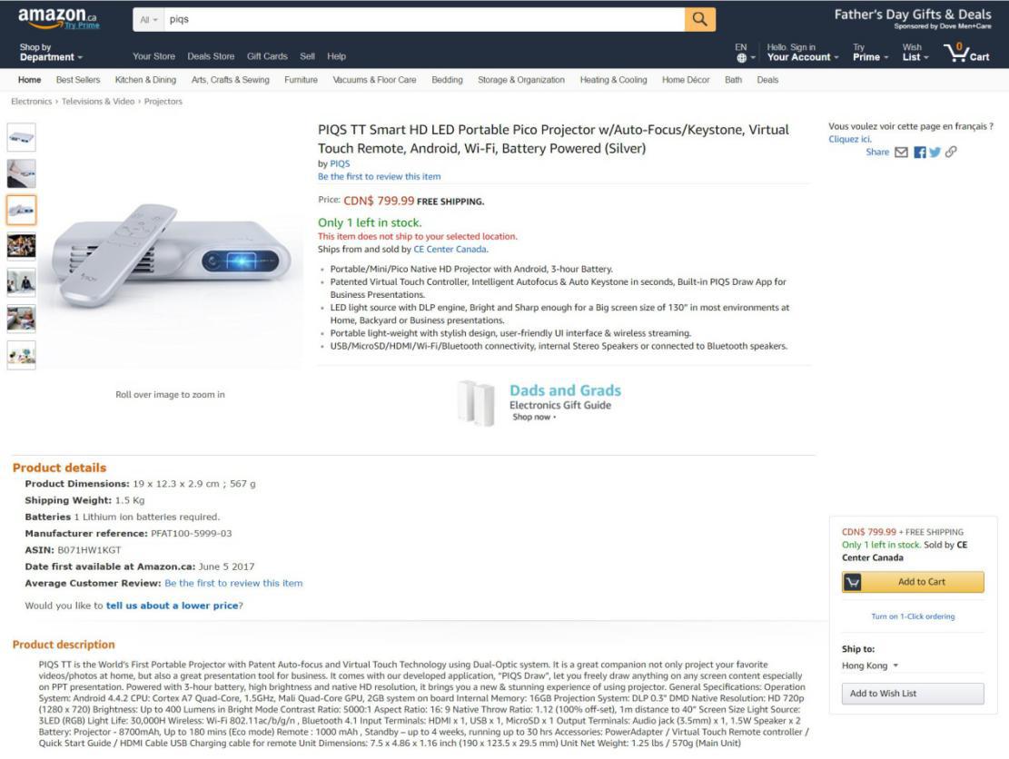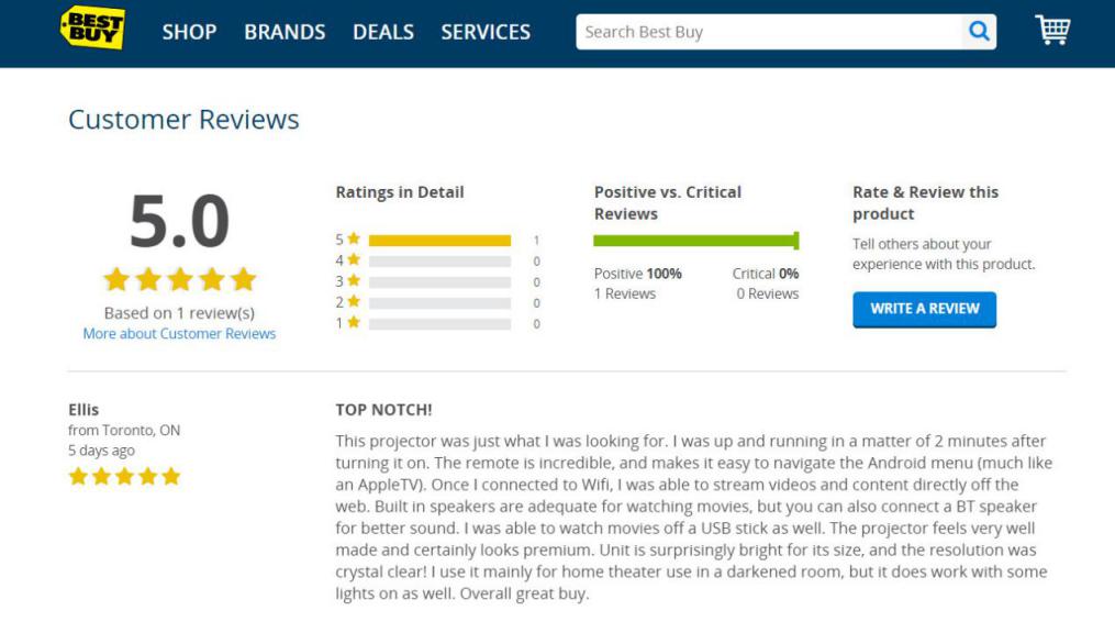 神画TT触控投影登陆美国、加拿大,进入该两国内最大的线上销售平台亚马逊和bestbuy正式销售,在投影市场掀起一新技术产品浪潮,吸引众多消费者购买,也受到一大批用户的喜爱和好评,例如在bestbuy上,TT好评率达到惊人的100%。