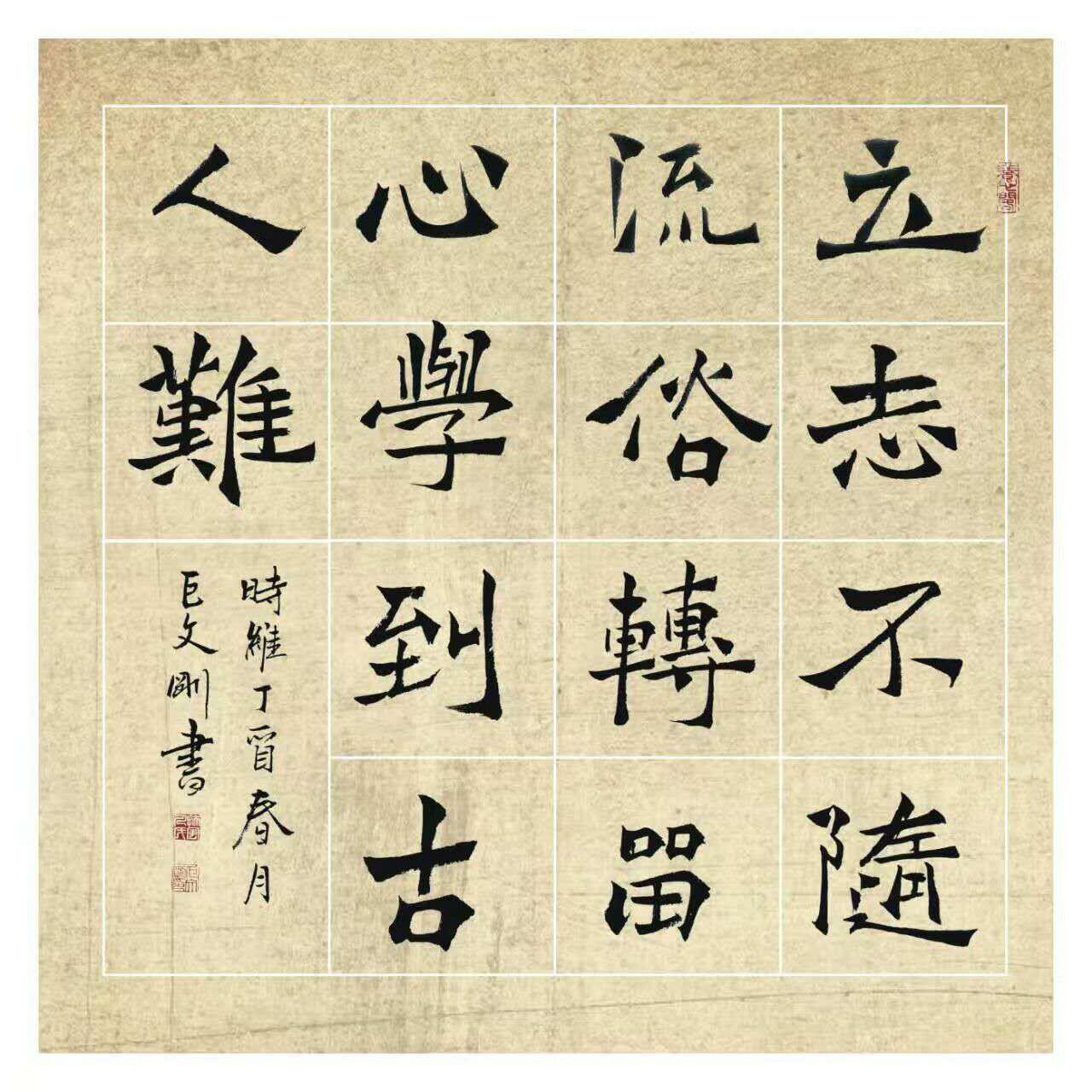 巨文刚,字学之,号养心阁主人,男,1976年9月生,陕西扶风人,教师。自幼拜师习书学画。主攻工笔花鸟、书法,楷、隶、行篆皆能。现为陕西省文促会会员、语文报书法版特约书法家、华清三维书画研究院副院长兼秘书长、陕西圣爱书画院副院长、陕西省三维发展实验学校书法委员会主任。 2000年6月入展“全国书画作品大赛” 2001年8月入展“文华杯”全国书法篆刻大赛 2003年3月编写《计算机初级应用》一书 2005年5月进入陕西省三维发展实验学校任教 2006年8月编写《三维格习字教程》第一版 2007年6月入展首届中国书画名人赛 2009年入编世纪风采人物第七卷。 2010年5月被中国教育家协会评为“中国民办优秀教师” 2010年6月楷书作品获第二届西柏坡全国书画国庆大展特别优秀奖 2010年8月书法作品《圣爱歌》入展首届“泰山杯”书画大赛 2010年9月书法作品被中国观音山书法艺术大展组委会收藏 2011年6月书法作品入展建党90周年全国书画展 2012年12月主编《中国教育牧爱》 2013年1月小楷书法完成《唐诗三百首》并成书出版 2013年3月完成20万字的小楷书法百米长卷(历时三年) 2016年6月入展一带一路全国书画大赛 2017年6月入选全国书画教师一百强 有较深艺术理论基础、又长与音律、AI设计、写作等,论文和作品多次发表在《陕西日报》《中国美术》《各界导报》《三秦楹联》等平面媒体,主编中国教育学会教育创新重点课题“百年树木,九年树人”子课题《三维格习字教程》一书。