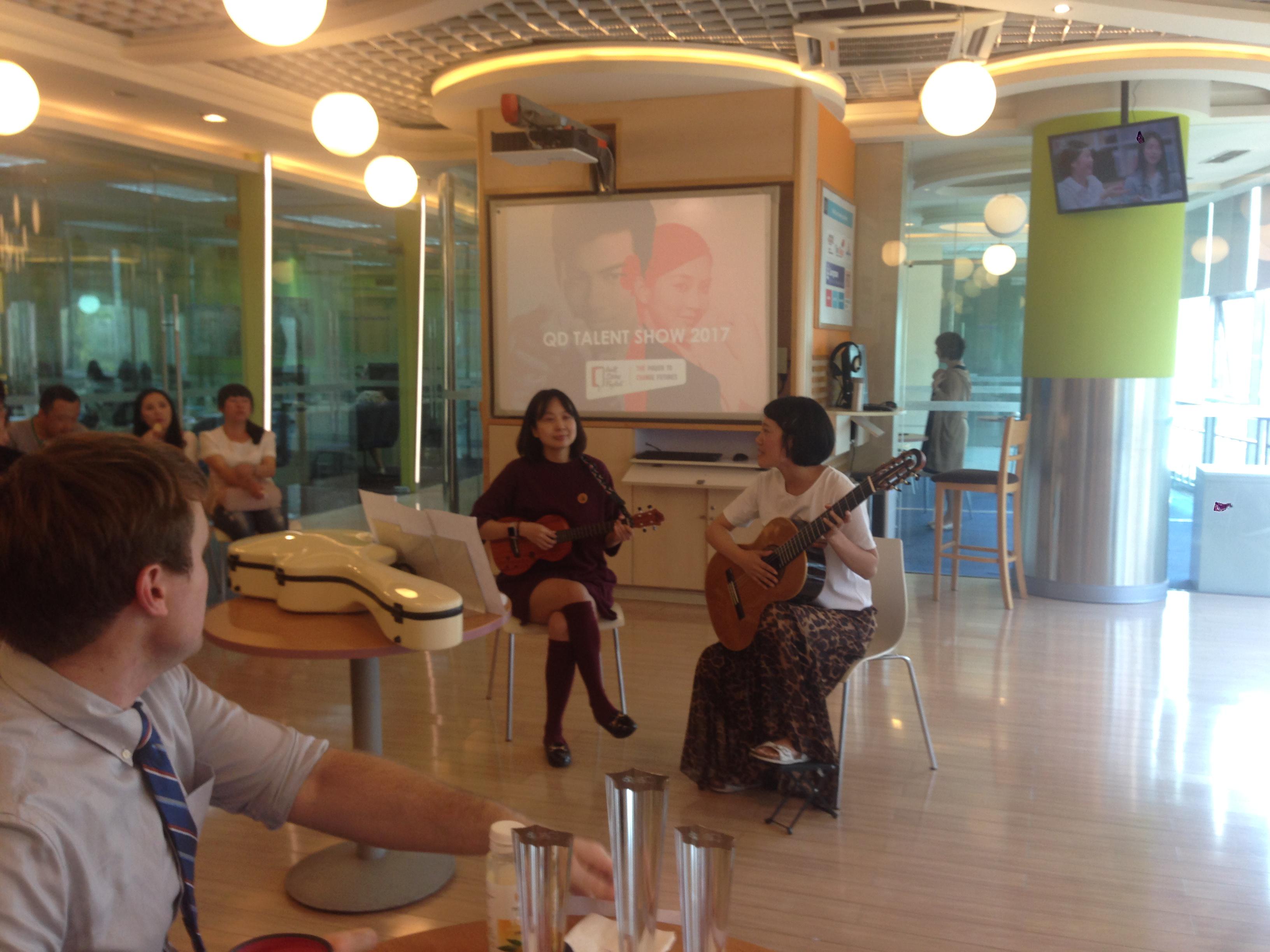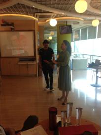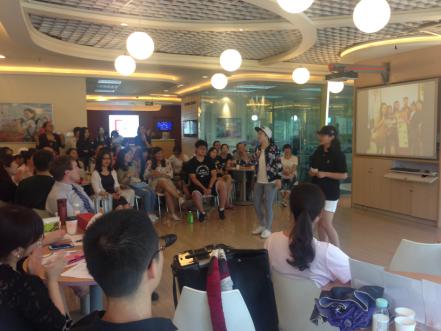2017年6月, 华尔街英语青岛黄金广场中心热闹非凡,来自美国的外教老师Troy带领华尔街英语中心的学生在这里举办了华尔街英语才艺展示的初赛与决赛。50多个学员积极踊跃地参与到活动中,十八般武艺同台竞技——唱歌、跳舞、乐器演奏等等,形式多样各有特色,表演才艺赏心悦目,现场观赛学员们掌声不断,纷纷表示平日里一起学英语的同学居然各个身怀绝技,而且还是相当有水平的才艺呢。