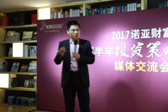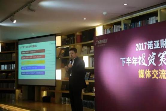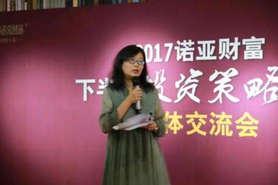 >>>>小诺领读 今日,《诺亚财富2017年下半年投资策略报告》媒体发布会在北京举行,全国60余家媒体集聚一堂共同探讨下半年投资趋势。这已经是诺亚财富连续五年发布投资策略报告,报告就宏观经济、海外投资、私募股权、A股市场、公募基金、中国私募证券基金、固定收益、国内房地产等八大板块做了详尽的分析,并给出了相应的投资建议。请看小诺第一时间为您带来的现场报道。 诺亚财富创始投资人、执行董事、首席市场官章嘉玉: 投资是一种哲学