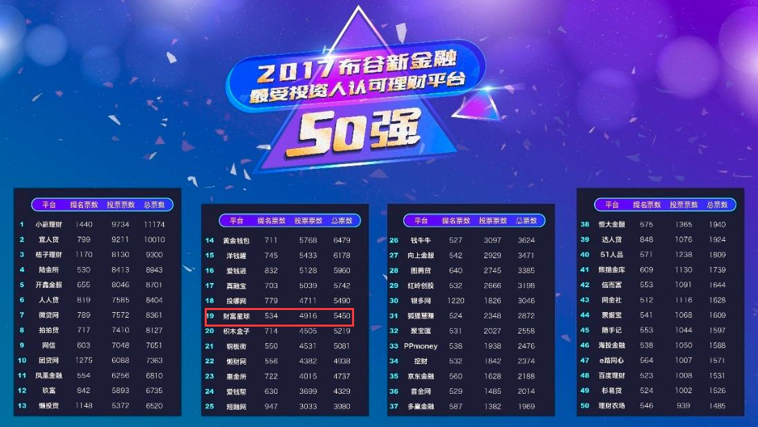 十万人票选,合规平台受认可 布谷新金融相关负责人表示,今年的榜单和去年有很大的区别,投资人更加关注平台的背景和发展潜力。此次,入选榜单的平台在产品创新、股东背景、成交量、风控等方面都表现突出,这说明规范稳健的平台收获了更多的掌声和关注。 作为互联网金融老兵,财富星球是其中的典型代表。财富星球(原“银客网”)成立于2013年12月,是中国互联网金融协会首批会员单位、北京市网贷行业协会副会长单位。目前,累计成交额超111亿元,累计注册用户达80万人。多年来,在网贷之家、网贷天眼等第三方机构的榜单评选中,一直稳居前30位。 自上线以来,财富星球一直将合规、透明、稳健作为平台运营的核心。2016年2月,接入央行互联网金融风险信息共享系统;2016年3月,首批接入北京市网贷行业协会“产品登记&信息披露系统”;2016年7月,率先与厦门银行完成资金存管对接;2017年年初开始向中国互联网金融协会、北京市网贷行业协会、北京市金融局、海淀区金融办等多级监管机构进行信息报备的工作。