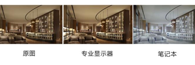 现在的笔记本硬件性能不错,又比较便捷,很多设计师使用笔记本工作、娱乐。可惜笔记本显示屏幕的颜色、细腻程度,仍然无法与专业显示器相比拟,笔记本的屏幕真的不适合设计。一组对比图可以看出笔记本和专业设计显示器的色彩差距: