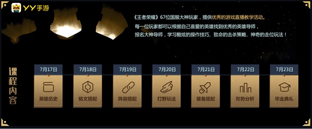 与其每天和青铜白银选手们“菜鸡互啄”,不如来“YY王者荣耀暑期速成班”弯道超车,和各位大神英雄导师学习酷炫的操作技巧、致命的击杀策略、神奇的走位玩法!从此上分超神当王者,把妹连杀MVP,再也不是梦。 |