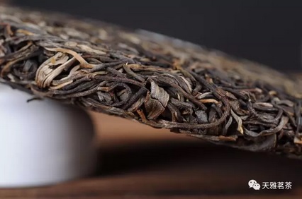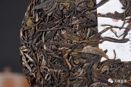 干茶 茶饼压制较松,饼面芽叶肥壮,色泽青褐,表面附有较多的淡金色芽毫。