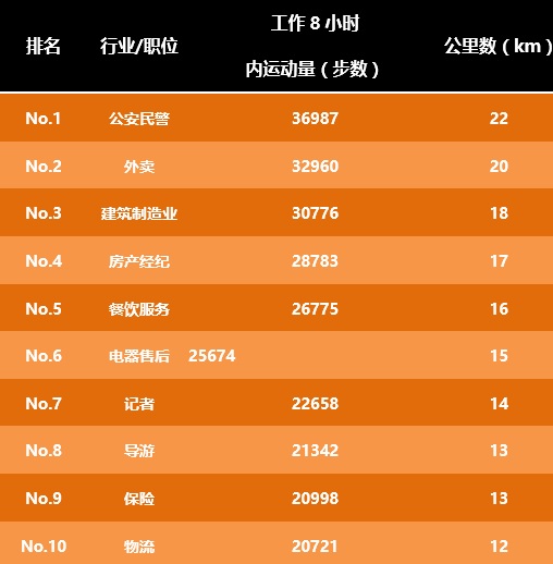 每天跑一个半马 该榜单的统计时间跨度,从2017年1月1日至7月1日,针对企业咕咚平台上的所有职业,时间节点为早上9点到下午5点,在该节点内,各领域企事业单位员工的运动量进行排名。大家熟知的餐饮外卖、物流快递等行业均不出意外地入榜。从数据可以看出,Top 10职业,每日步数全部超过20,000步,相当于每天步行12公里以上。排前两位的职业运动量,竟然达到了“每天跑一个半程马拉松”!
