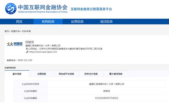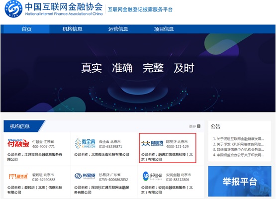 (阿朋贷机构信息展示页) 互联网金融登记披露服务平台由中国互联网金融协会发起,上线运营两个月以来,受到了业界的高度关注。该平台构建了从业机构信息披露正向激励和公众监督相结合的长效机制,有力促进了从业机构认真贯彻落实监管部门信息披露要求,也帮助行业逐步树立守法经营、诚实披露的理念,展现透明化、阳光化的行业形象。 |