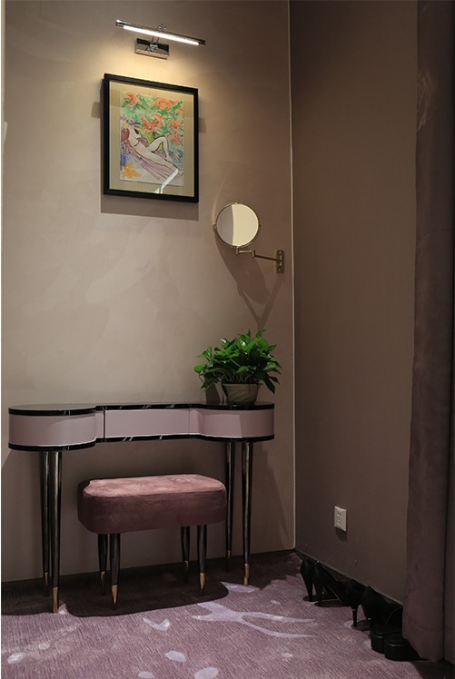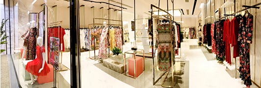 旗舰店采用仿天然石材PVC与进口意大利大师涂料形成令人垂涎时装背景,通过不同造型与形状的枪黑和浅金色不锈钢的对比,已形成线与面的自然绎美。