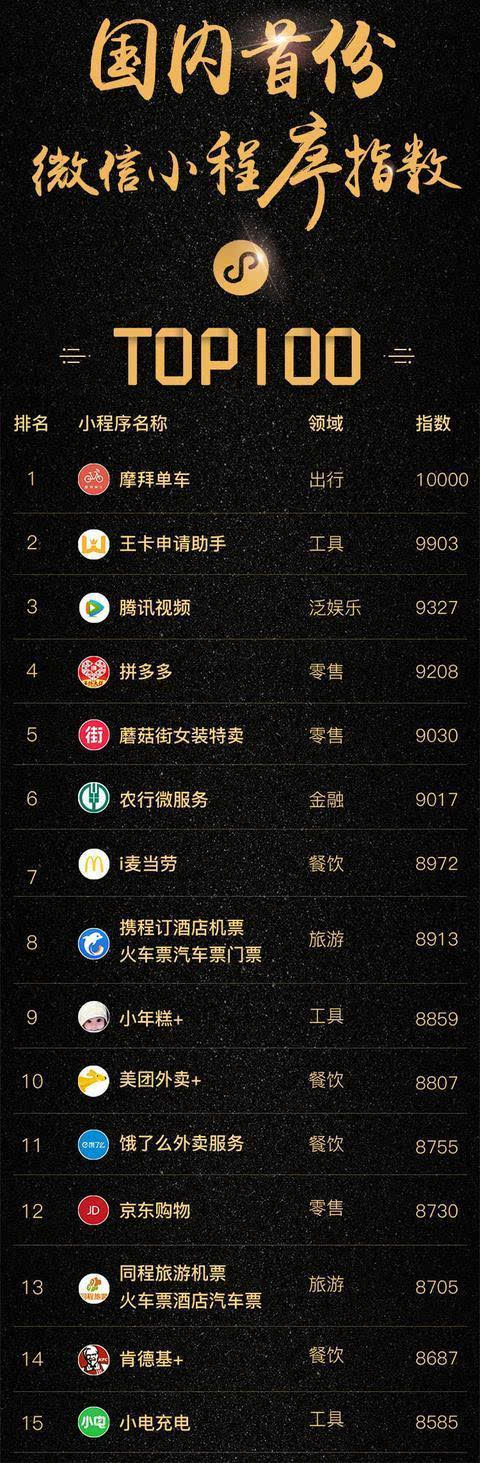 微信小程序的超级流量红利时代来了。 8月12日,首家小程序统计平台阿拉丁首次发布了国内2017年Q2微信小程序指数TOP100榜单。在这份榜单中,共享经济领域头部创业公司的表现十分抢眼,摩拜单车位居榜首,同时共享充电宝领域关注度最高的小电科技居总榜15位,且在共享经济类小程序排名第2。其中,TOP100榜单中工具类小程序为36个,占比超过1/3,小电在工具类小程序中排名第3,彰显小程序轻应用和工具性的属性。