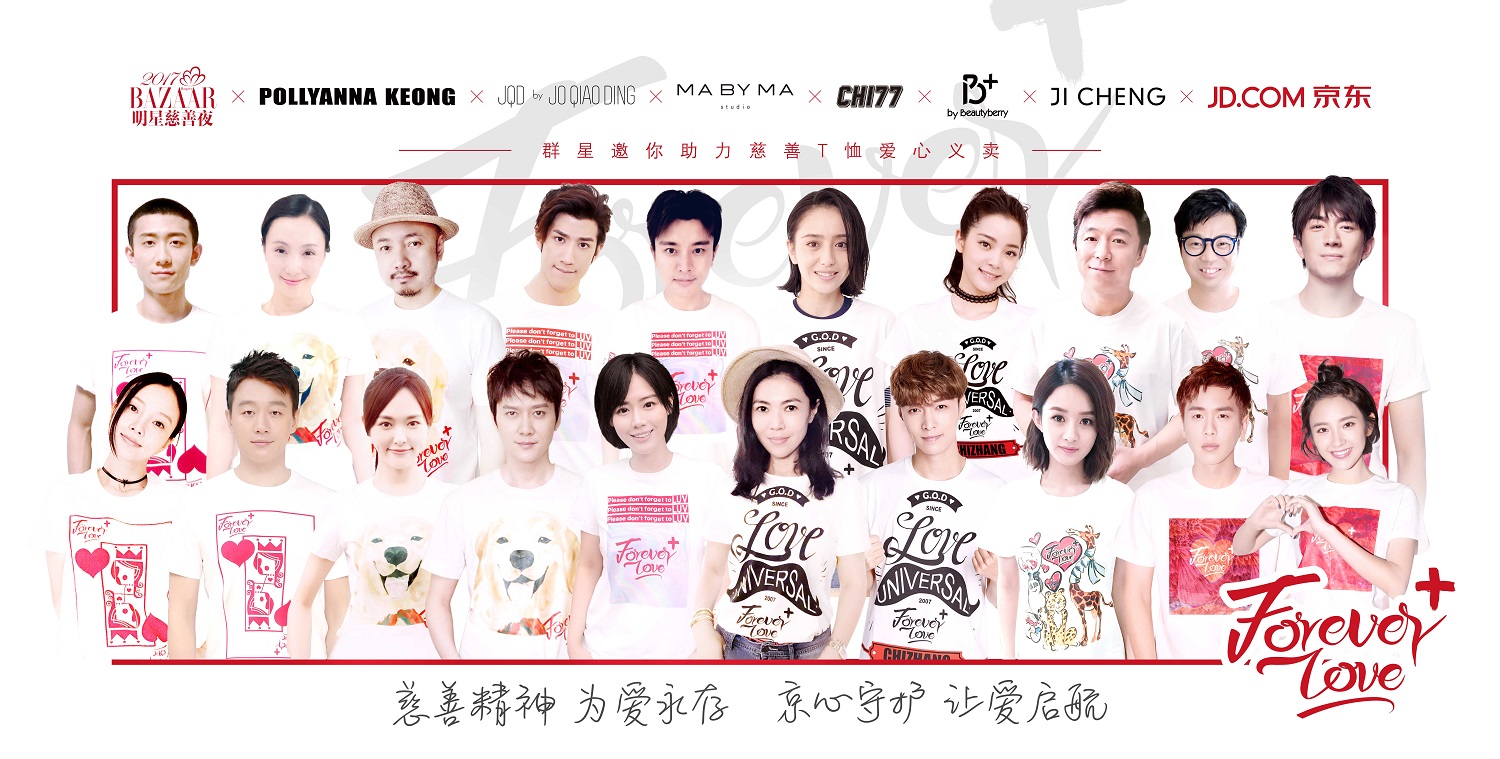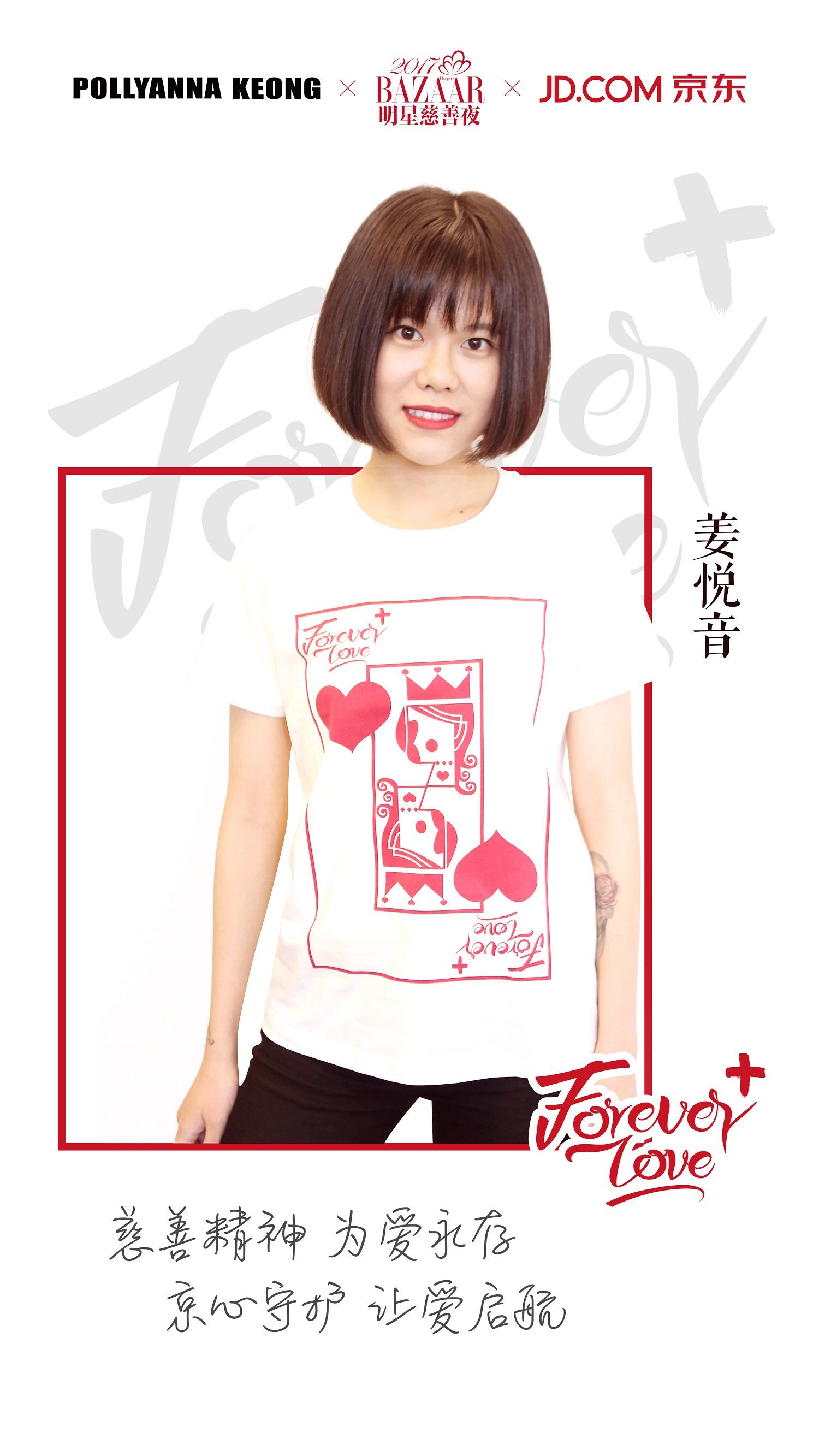 姜悦音的设计风格多为俏皮可爱、简约摩登。她设计的这款T恤延续了POLLYANNA KEONG经典的扑克牌形象,用鲜明精细的图案描绘出Forever Love的概念。色彩上则采用代表纯洁的白色搭配温暖的红色印花,用图案的寓意和经典的配色完美诠释Forever Love的宗旨。万物瞬息万变,唯有爱是永恒,姜悦音的这件慈善T-Shirt传递的正是这样一个美好的愿景。 二十余位明星因爱集结 身体力行为慈善联盟 此次2017 BAZAAR明星慈善夜和京东的合作受到众多明星的积极响应,黄渤、徐峥、陶虹、唐嫣、赵丽颖、张艺兴、佟大为、马思纯、张一山、林更新、李小璐、贾乃亮、张若昀、唐艺昕、冯绍峰、佟丽娅、欧阳娜娜、王迅、李治廷、黄靖翔二十余位明星因爱相聚,他们将穿上这爱的T-Shirt身体力行地传递慈善的力量,将爱的温暖传递到更多的地方。
