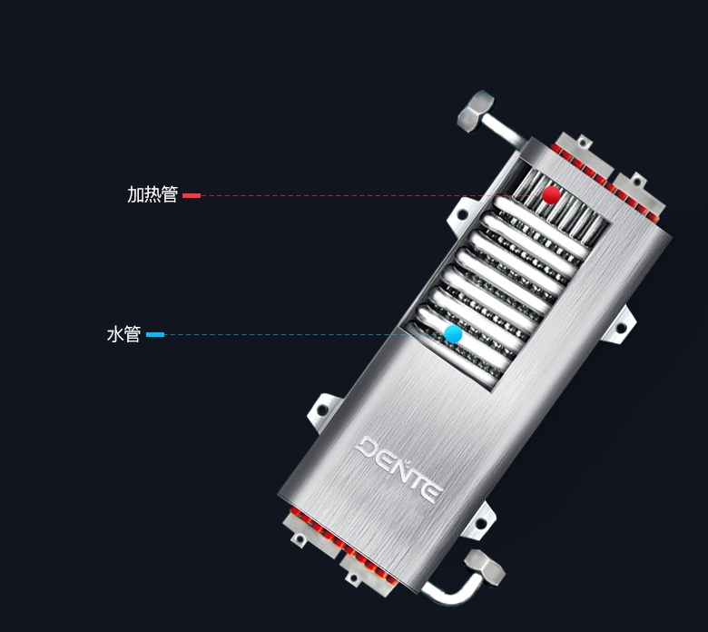 二、发热体 即热式热水器决定质量的关键是它的核心部件——发热体,而发热体质量的关键要看选用的材质,目前市场上的发热体主要有金属发热体、石英管发热体和压铸铝发热体。 【金属发热体】 金属发热体类似家庭中烧开水用的热得快,在工作时发热体完全浸泡于水中,水电一体,易结水垢,使用寿命在5-8年左右;