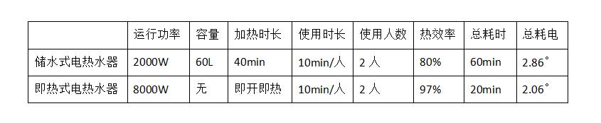 对此,我们不计算储水式热水器余下未使用热水损耗的功率,将即热式热水器与储水式热水器来对比。