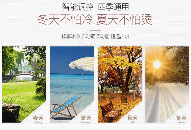 由上表可以明显看出同样是两个人使用热水器,即热式电热水器不仅比储水式热水器节约时间,还更省电。 目前市场上即热式热水器的功率在4000W~8000W不等,夏季只要4000W功率,功率大了浪费,冬季4000W又不够,需要8000W功率的即热式热水器冲澡才舒服。 所以在选择即热式热水器的功率时,一定要选择智能变频的热水器,智能变频的即热式热水器能够根据进水温度自动调整热水器的使用功率,一台抵多台,这样无论在四季使用时既舒适又不会造成浪费。