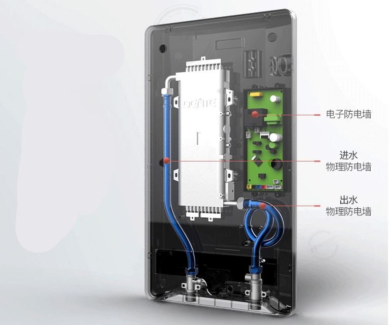 2、物理防电墙+电子防电墙双重保护 防电墙技术的普及给消费者吃了一颗定心丸,即热式热水器市场又迎来了春天;选择带有物理防电墙+电子防电墙双重保护的即热式热水器是如今消费者的首选。