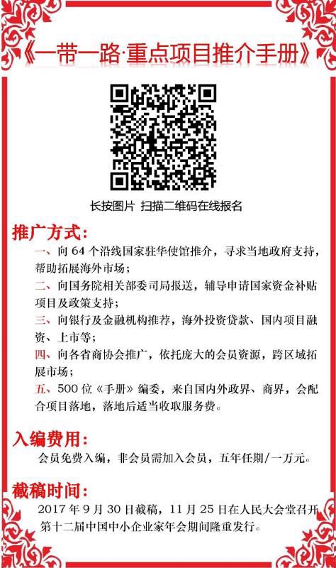 近期,《一带一路沿线国家中小企业合作·重点项目推介手册》备受国内外关注。作为2017“一带一路”国际合作高峰论坛的后续联络与合作平台,《项目手册》得到了沿线国家驻华使馆、国内政府有关部门、国内外民间组织商会、国内外银行及金融机构、国内外中小企业的高度重视及支持参与。 据主办方日前对记者介绍,企业如需产品推广、项目融资、拓展市场,品牌宣传、技术合作、承包工程、招商引资等,经过审核可汇编到项目手册。手册向64家沿线国家驻华使馆推介,寻求当地政府支持,帮助企业拓展海外市场;手册向国务院相关部委司局报送,符合国家资金补贴的项目,辅导申请政策支持;向国内各省商协会推广,配合跨省市拓展市场,依托商协会众多会员资源;向国内外银行及投资机构推荐,让企业插上资本的翅膀。 企业申请项目入编,需经过《一带一路项目推介手册》编委会委员推荐,编委会由国内外政府部门领导、科研院校专家、相关领域知名学者、社会组织商协会会长、银行及金融机构负责人,以及各行业知名企业家担任委员组成。