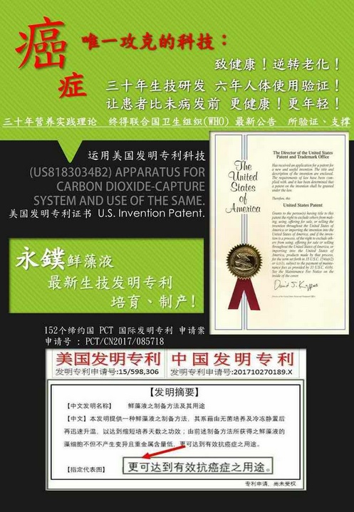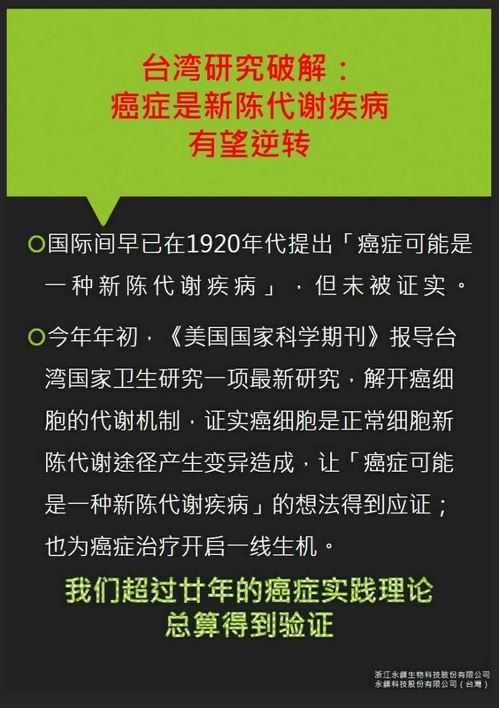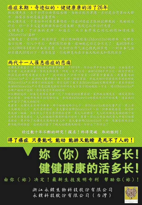 攻克癌症的唯一科技「致健康、逆转老化 」 让癌者,比患病前更健康、更年轻。 健康大问题,癌魔窥伺,英国癌症研究组织( Cancer Research UK)发表报告,预计英国在1960年后出生的人,当中一半都会患上癌症。那全球比例将更严重。 浙江永镤生物科技股份有限公司、(台湾)永镤科技股份有限公司,之命名设立,是为纪念已故林永镤先生。永镤先生青壮年即罹患癌症末期,医院已宣告治疗无望,经其老师从日本带来纯化的微细绿球藻菌种,在其饲料厂实验室培养每天饮用,配合饮食完全营养的吸收,8 个月癌细胞完全消失,健康的延续了26年的生命,西元1994年4月到日本谈生意。而当时台湾气温已摄氏30多度,一到日本气温却在摄氏10度以下,感染感冒,引起肺炎而在日本大阪的太和医院往生。 永镤先生于1974年成立了亚洲第一家微生物藻类研发生产中心,致力于微细藻类之研究、量产。之后却一直未见癌患使用而获健康者,甚者永镤先生家人两代亦有11位亲人患得癌症而过世。虽永镤先生癌症末期,医院已宣告治疗无望,能健康的延续了26年的生命,全球亦有无数的实验证明微细绿球藻具抗癌功效。但为什么? 经超过三十年的探究,终解生技迷惑,达成"有效抗癌症之用途"的微细绿球藻菌种的定性、及培育、制备科技。并申请了中国、美国等国及PCT国际发明专利之生技发明专利申请。历经超过六年的人体使用证验,证明了,攻克癌症的唯一科技「致健康、逆转老化 」,让癌者,比患病前更健康、更年轻。 即使得了癌症,只要了解人体癌细胞如何产生的,转换心态是非常重要,只要能吃能排能动又能睡,是死不了人的!