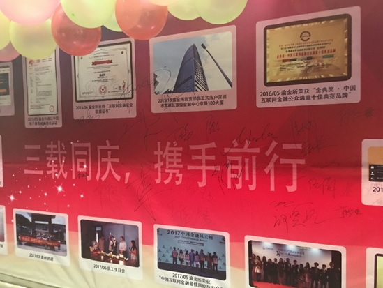 (周年庆中,渝金所员工在荣誉墙上留下了自己的名字) 据了解,深圳渝金所自2015年10月平台正式上线,同期落户深圳市罗湖区顶级金融中心京基100大厦,11月渝金所与太平洋保险签订《资金安全保险合作协议》,年底香港安诚集团旗下深圳渝金所金融服务有限公司全资控股重庆渝金锁电子商务有限公司,标志着渝金所步入全面发展的上升时期。 2016年3月,渝金所金融服务平台系统全面升级,让用户融投体验更加便捷。与此同时,更加高效而专业的互联网技术精英团队、平台风控团队也成为了平台不断发展壮大的基石。2017年6月,渝金所平台交易额冲破10亿元大关,7月,与广东华兴银行正式签署存管对接协议,并随即正式上线银行资金存管系统。在互联网金融平台领域,渝金所踏实前行,每一步都走得极为坚实稳健。 作为一个稳健发展的互联网金融平台,渝金所严格遵循行业监管政策,从内到外打造出一个让投资者“放心投资,财富增值”值得信赖的平台。在多年的发展中,渝金所荣获“互联网金融安全联盟证书”、“中国互联网金融公众满意十佳典范品牌”、“中国互联网金融行业优秀示范企业”、“中国互联网金融最佳风控与安全奖”“2017最佳投资理财机构”等荣誉。