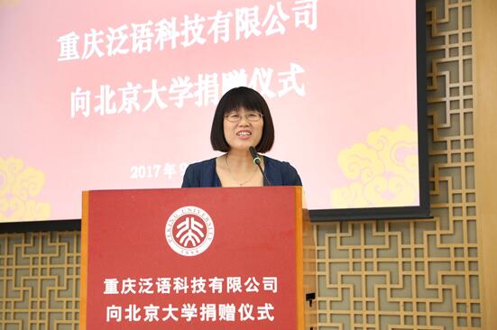 9月1日,重庆泛语科技有限公司向北京大学捐赠仪式在北京大学教育基金会北大之友报告厅举行。 重庆泛语科技有限公司总经理谭涛先生,重庆泛语科技有限公司副总经理于慧芳女士出席仪式。北京大学副校长王博教授,教育基金会秘书长邓娅博士,信息管理系党委书记张久珍教授、副系主任王继民教授,及北大师生代表等出席,捐赠仪式由北大教育基金会副秘书长耿姝主持。