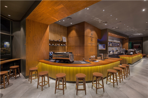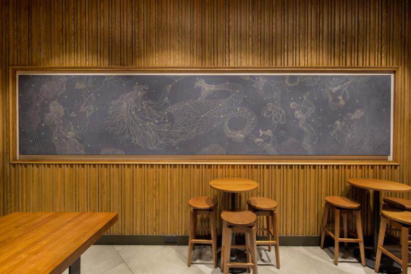 店经理黄晔在手起杯落间介绍道:“每一位咖啡师的手法差异使得咖啡所呈现的风味有所不同,所以每一杯咖啡都会带着咖啡大师的个人印记,会经常找同一位咖啡大师煮制咖啡的顾客一定是发现了这个小秘密!”咖啡大师们在“舞台”般的臻选吧台进行手冲或虹吸咖啡的演示时,总能吸引不少顾客进行围观。 日月星辰,营造梦幻“第三空间” 星巴克致力于让顾客享受“第三空间”的理念也融入进臻选门店的设计中,从门把手上星巴克臻选品牌的字样,到舞台式设计的臻选吧台,每一个细节都独具匠心,别具一格。 这是海南的第一家臻选店,而因其坐落的位置和门店的设计,顾客们都对它有个特别的昵称——“日月星辰”,寓意为在日月广场中的神秘“星”空间。走进门店,你一定会被嵌在暖黄墙上的巨幅版画所吸引。这是一幅星巴克双尾美人鱼遨游在浩瀚星空中的场景图,而画中的星图与日月广场的以“十二星座”命名的建筑形成巧妙对应,静静驻足于画前,仿佛思绪已经飘到无垠的夜空中。