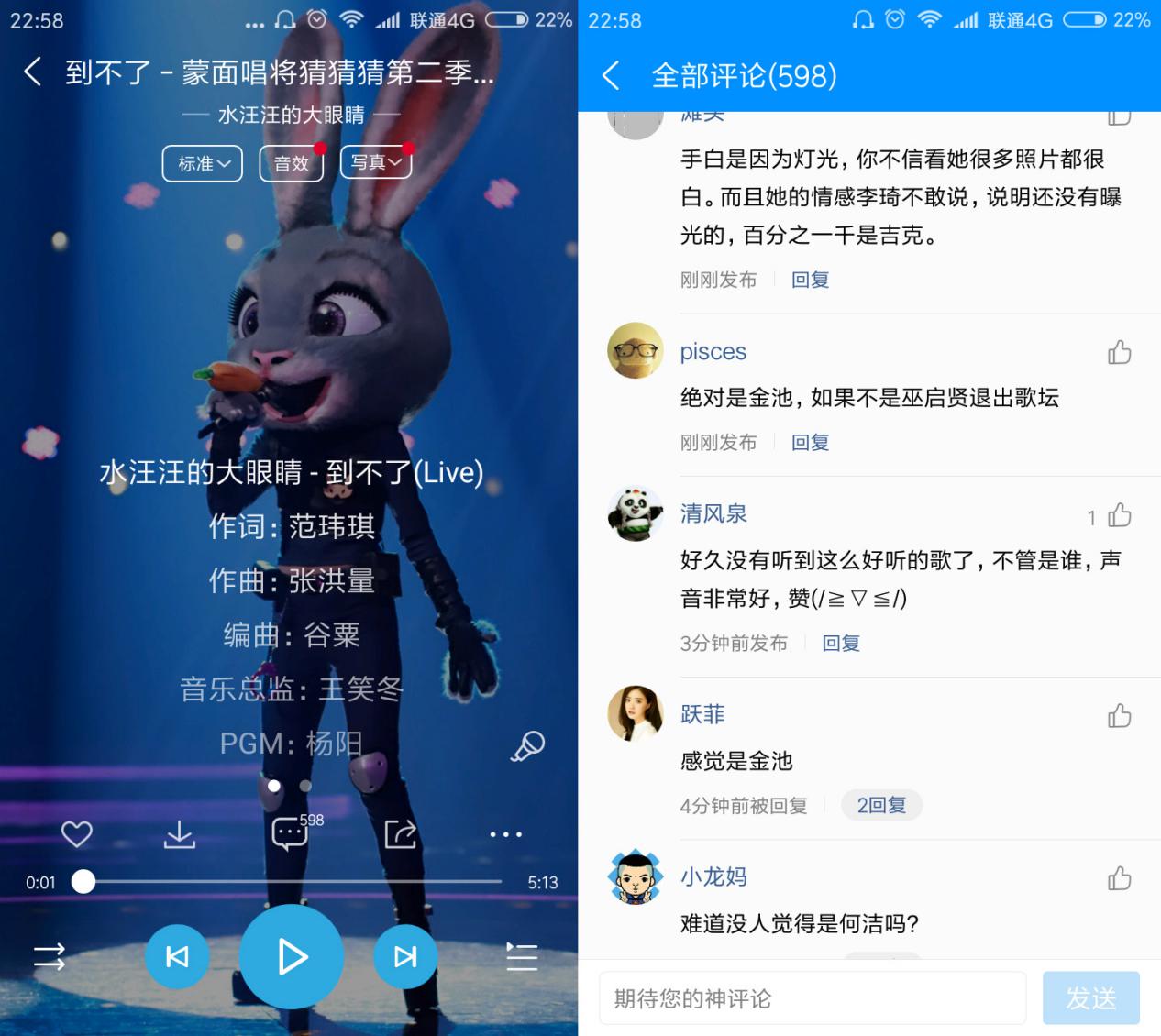 而在本期新晋蒙面唱将中,最萌的还数一身兔警官朱迪造型出场的“水汪汪的大眼睛”,开场先要求“起个范儿”摆pose,令Ella直呼“好可爱”。但活泼的“兔警官”唱起歌来却十分深情,以一曲缠绵悱恻的《到不了》强势杀入QQ音乐蒙面唱将第四期人气歌曲TOP2,也吸引了网友们在歌曲评论区及酷狗音乐竞猜区对其身份的烧脑猜测,目前,金池、何洁都已被列入候选名单。