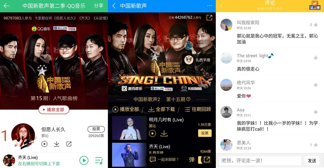 10月8日晚,带着网友们三个月的期盼,《中国新歌声》第二季全国总决选终于在鸟巢展开终极决战。凭借一曲悠扬又爆裂的《齐天》,刘欢战队的扎西平措力夺本季《中国新歌声》的冠军,而在节目独家音频合作平台腾讯音乐娱乐的旗下三大平台QQ音乐、酷狗音乐、酷我音乐,更有超过一亿人次一路见证了冠军的诞生。随着比赛结果的新鲜出炉,网友们也纷纷涌入三大平台的评论、弹幕区,为所有华丽蜕变的“新歌声”们送上最美好的祝福!