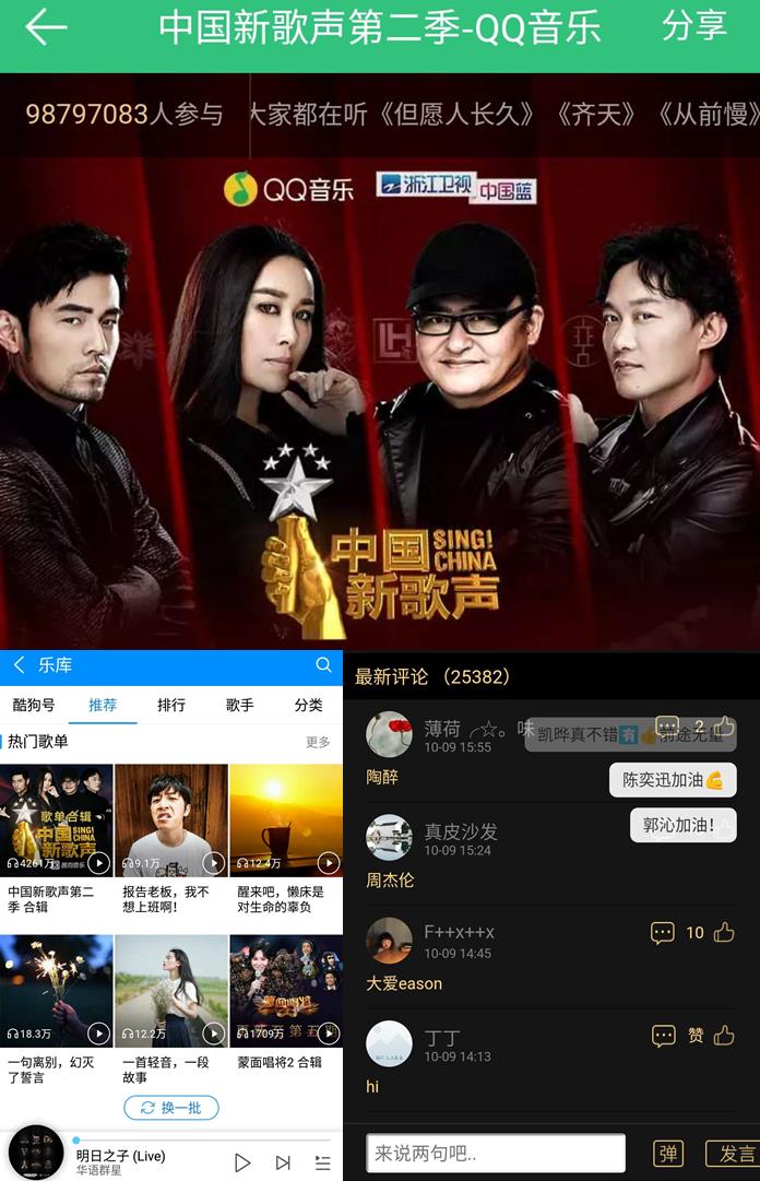 在继去年凭借多元玩法成为《中国新歌声》第一季的最佳拍档后,腾讯音乐娱乐今年再度与其携手,打造全新综艺互动体验:时时传送节目战况的王牌功能“零时差专辑”自是不必多说,将弹幕、礼物等功能融为一体的评论体系也方便了网友们为喜爱的选手打call;不仅如此,腾讯音乐娱乐对新歌声的专题打造也更加阵地化,将各类榜单、歌单、乐评、热评等丰富板块合力呈现,腾讯音乐娱乐也成为新歌声粉丝支持学员、导师,听歌、议歌的主战场。截至目前,仅QQ音乐的新歌声专题页面参与互动人数就几近破亿,相关歌单登上酷狗推荐首页,酷我热评更超2万。