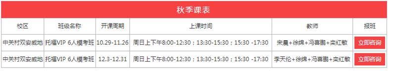 上午模考,下午精讲,基于秋季开学旺盛的英语市场培训需求,江博教育推出托福VIP6人迷你小班授课新模式,受到了众多家长的欢迎。记者在走访中也发现,不仅有基础薄弱的学员报名,报名的尖子生也不在少数,究其原因,主要是即将考试,很多学员都想快速适应考试的强度及考场情况,提升考试成绩。 据了解,江博教育托福VIP6人模考班开课周期为10月29-11月26日、12月3-31日,上课时间为周日上下午8:00-12:30、13:30-15:30、15:30 -17:30。针对托福考试内容,江博教育专家老师会针对学员学习过程中出现的问题进行分析,并找到相应的解决方法,快速提升学员的学习成绩。与此同时,由于托福考试是机考,学员提前进行模考训练,有利于学员提前熟悉考试强度和考场情况,发挥出优异的成绩。准备参加12月、1月托福考试的学员,可以选择这两期托福模考班,绝对事半功倍。