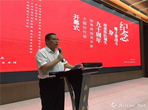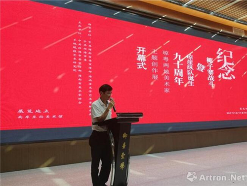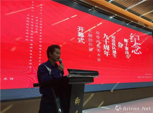 ![]() “纪念椰子寨战斗暨琼崖纵队诞生90周年琼粤两地美术家主题创作展·广州站”海报 2017年10月11日下午,“纪念椰子寨战斗暨琼崖纵队诞生90周年琼粤两地美术家主题创作展·广州站”在南岸至尚美术馆开幕。本次展览共展出琼粤两地30多位艺术家的40件作品,并在现场揭幕雕塑家许鸿飞应海南方面邀请创作的雕塑作品《椰子寨战斗》。 ![]() 本次展览开幕式主持人广东民族乐团男高音、国家一级演员陈前
