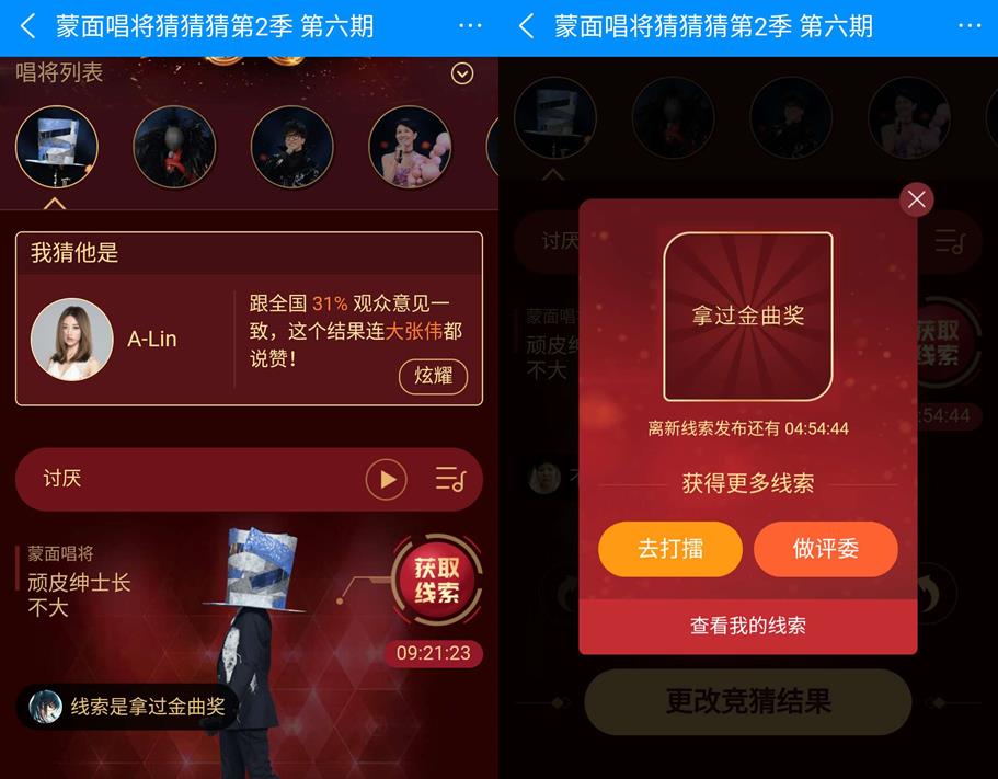 在继第四期节目怒揭5面之后,周日刚刚落下帷幕的《蒙面唱将猜猜猜》第二季第六期节目再度“连中五员”。通过零时差高品质纯享音频和新鲜有趣的互动和独家线索,节目独家音频合作方腾讯音乐娱乐集团旗下QQ音乐、酷狗音乐、酷我音乐吸引了大批网友前来集思广益,不仅一举揭开了困扰大家两周的“淘气的粉红女王”李慧珍的神秘面纱,“何必在乎我是谁”苏慧伦、“人间极品小魔头”刘维,新晋补位的“风中凌乱的小公举”马丽,“刺”薛之谦也都接连猜中。