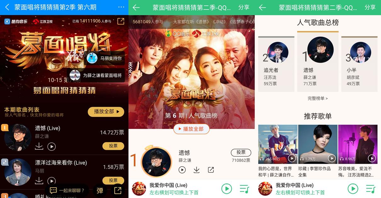 在当晚的节目中,率先征战的“风中凌乱的小公举”头顶小风车,以一曲纯净通透的《漂洋过海来看你》感动全场,由于陶晶莹的缺席,猜评团甚至一度认为就是陶子姐。不过凭借独特的声音特质,“来自东北的马丽”还是在采访环节被认出真“声”,对于其“被喜剧掩盖的音乐天赋”,QQ音乐网友也表示惊艳。而另一位新晋登台的“刺”也遭声线“出卖”,一张口就被认出是薛之谦本人,一曲《遗憾》唱尽悲欢离合,不仅与马丽双双登上酷狗音乐蒙面唱将猜猜猜的人气榜前两位,更以68万票“空降”QQ音乐当期人气歌曲榜和人气歌曲总榜冠军,成为最强补位唱将。
