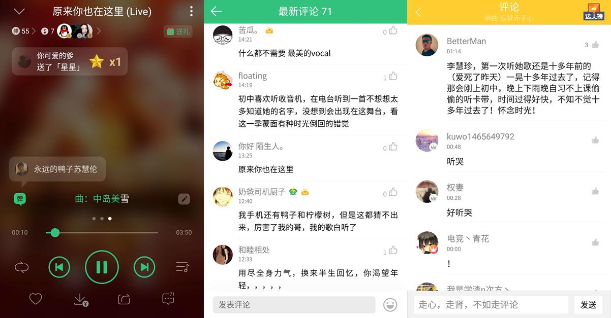 此外,代表一段华语经典时代、好久不见的李慧珍和苏慧伦的成功揭面也被网友称“有时光倒回的错觉”。重新拿起话筒,李慧珍用一首《追梦赤子心》诉说了淡出歌坛的这些年是如何因为音乐而执着重生,歌声中饱满的能量与感动,也触动到了大家内心的柔软,更有酷我音乐网友追忆起第一次听李慧珍歌曲的情景,感叹时光流逝,关于李慧珍的相关歌单也来到了QQ音乐的专题推荐。